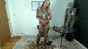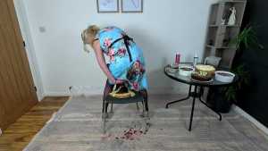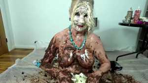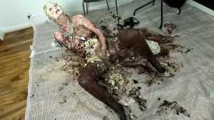Eventually I remove my dress and go onto the floor to play with more cakes covering my exposed body and underwear. Removing my panties and bra I give myself a complete cake facial with a large cream cake covering my face and hair.