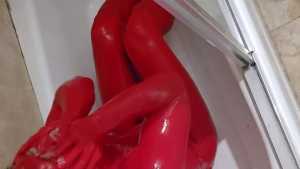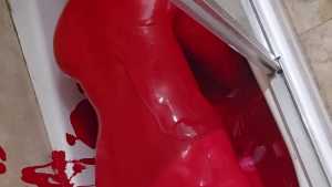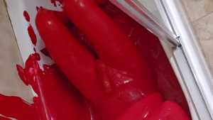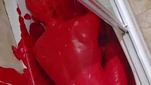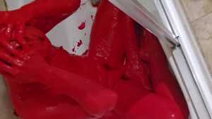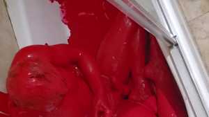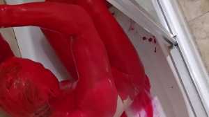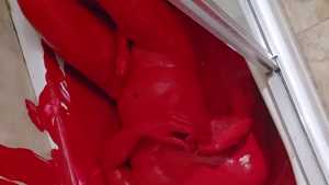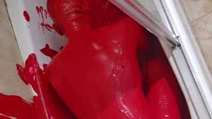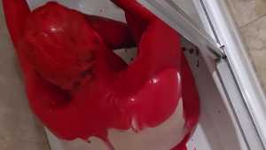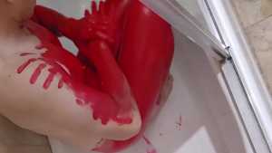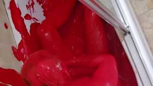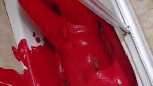 Bum playing with red tempera paint. Covering himself from head to toe. The paint feels amazing! He proceeds to use the nipple clamps on his nipples before jacking off.