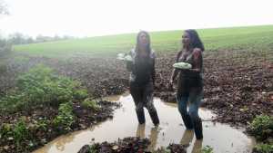It's a freezing cold day and I can't wait to show messymegan how fun messing and playing around in mud is! Dressed in our wellies tight jeans and white tops, you can see it's freezing cold by how hard our nipples are! I start off by splatting Meg in the tits wth mud and the fun continues from there! We fill our jeans up, splat each others arses and I finish off by presenting Meg with some pies.
