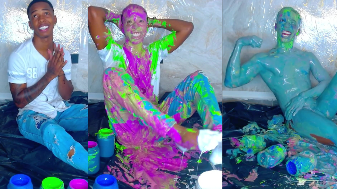 First, he covers his face with bright green slime, laughing as it runs down. Then he switches to pink, dips his feet into a bucket of thick white slime, and ends up drenched from head to toe in layers of white and blue. By the time he's done, he's a living work of art! He undresses, spreads the slime trough his gorgeous naked body, and dresses back again.