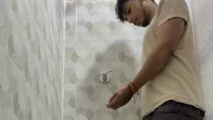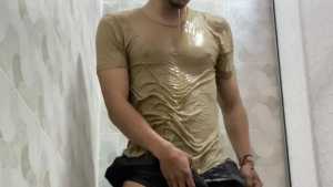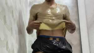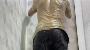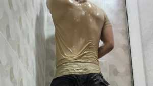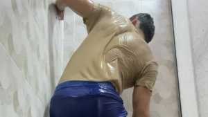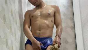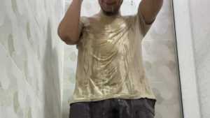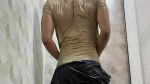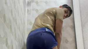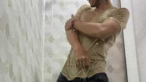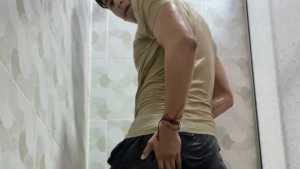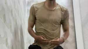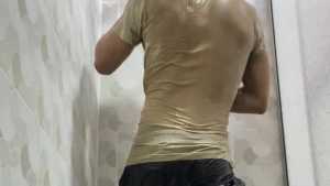 Mike is really hot today, and he's going to get really wet in the shower, even in his t-shirt and shorts. Ten amazing minutes, including the final moments in his blue boxers! Fantastic!
