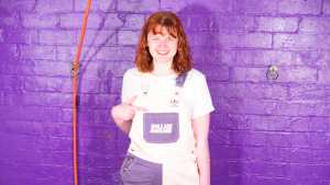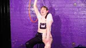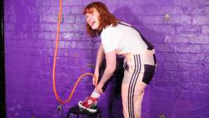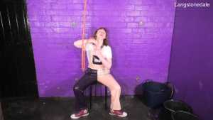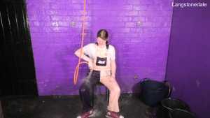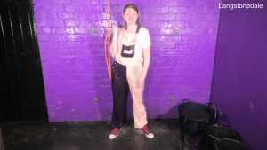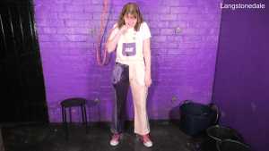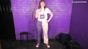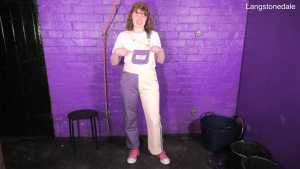 Dressed in a pair of "Girls are Great" pink and purple dungarees over a white t-shirt and pink, black, and white Converse basketball boots, Miss Abigail sticks the dungeon hose down the front of her dungarees and asks the Water Fairy to turn the water on. Because it takes a moment for the boiler to fire up, the initial flow of water flooding inside her clothes is freezing cold, and Abigail squeaks in reaction as the cold water erupts downwards through her dungarees, visibly soaking them as it goes. After a moment the heating kicks in and the water rises to a comfortable temperature, and Miss Abigail goes on to enjoy thoroughly drenching her outfit and shoes until she's utterly soaked.