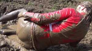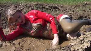 Then she lies down on her stomach in the mud pool then rolls onto her side to muddy up her red top.