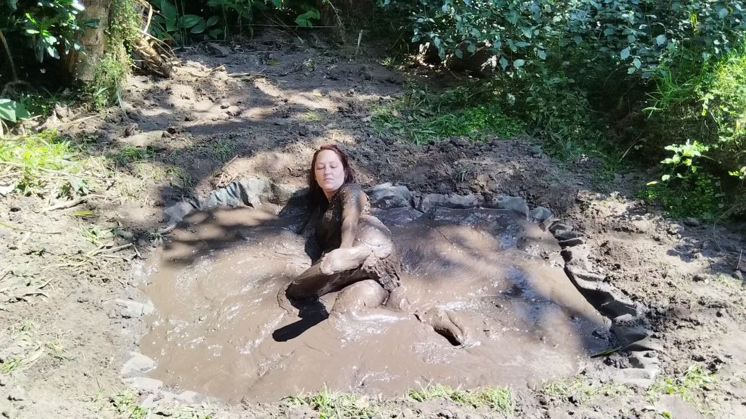 Wearing white cute socks I walk around in some dirty water puddles and then move on to the amazing mud pit, making sure I get completely covered, showing off my muddy socks. I then go over to rinse off under the hose.