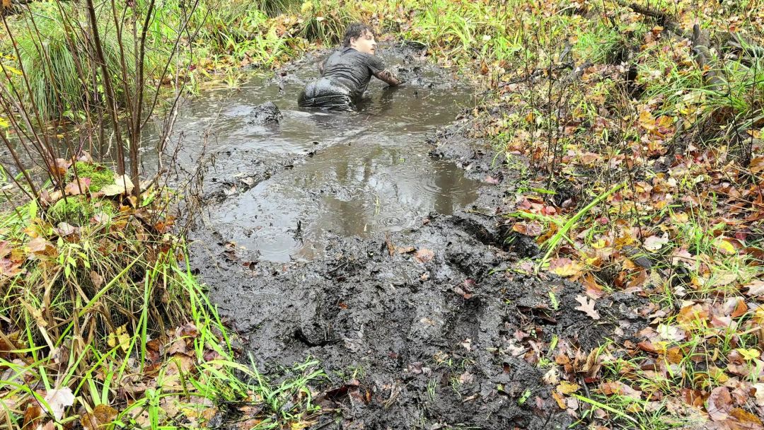 Rich head out in the rain to his favorite trail. Hes wearing american eagle boxers, skinny gray pants, abercrombie shirt, and a pair of Vans. Hair soaked by rain and getting slowly more wet he sucumbs to a big puddle, which he turns into the perfect mud puddle. He gets more and more covered by mud as he walks through, rolls around, and rubs himself with mud.