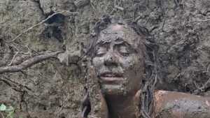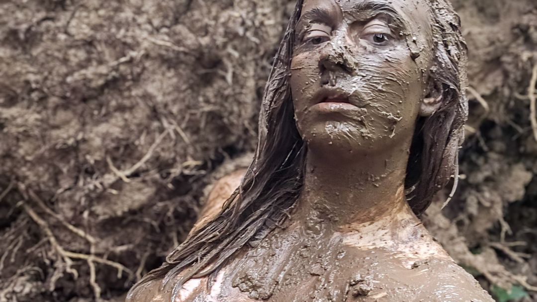 I strip off my shorts and crop top, and start to cover my bra and panties in mud. You can see they're both already soaked through from the water and they are trashed almost immediately.