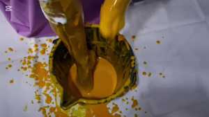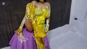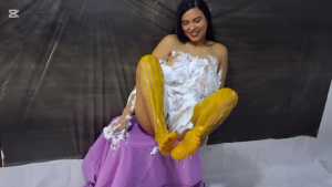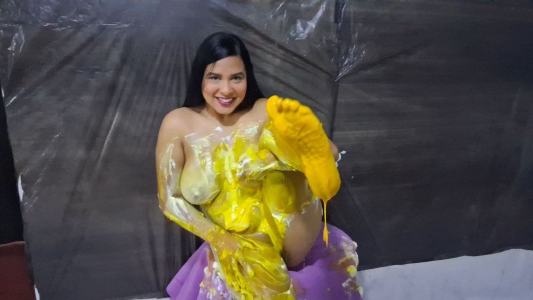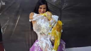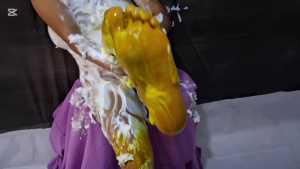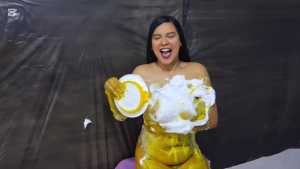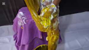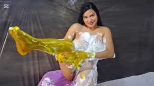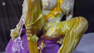 As the nearly twenty-minute scene continues, she becomes a charming mix of yellow slime and fluffy cream. Her ankles remain buried in the goo, which clings tightly and stretches dramatically each time she shifts her stance. Her long hair, now decorated with streaks of cream, swings with each laugh, making the scene even more delightfully chaotic.