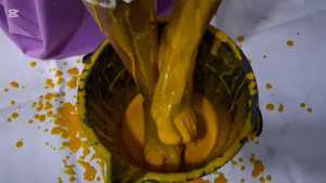 Over the next minutes, she moves her feet around with growing enthusiasm--stomping lightly to create waves, rotating her ankles to swirl the goo, and lifting her legs just enough to let thick curtains of slime slide back into the tub. Each movement sends small splashes outward, adding new streaks of yellow to the messy set.
