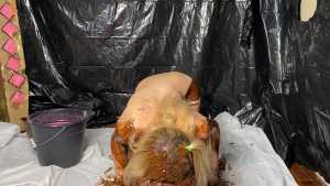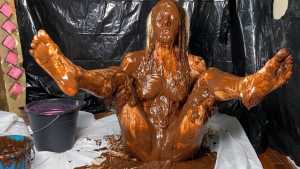A naked Kaydens starts by pouring liquid chocolate directly over her pussy and tits before rubbing it over her feet, and legs, her face, arms and even her hair... giggling as she does so. She then head dunks into a bucket of chocolate, getting amazing facial coverage. She then rubs plenty over her bare pussy, sticking her tongue out as she does so.