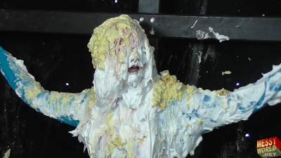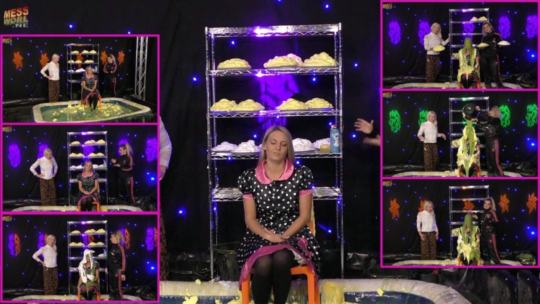 Mollie is absolutely covered in pies, slime, foam and gunge by Lisa and Suzie whilst wearing a not-so-flattering dress.