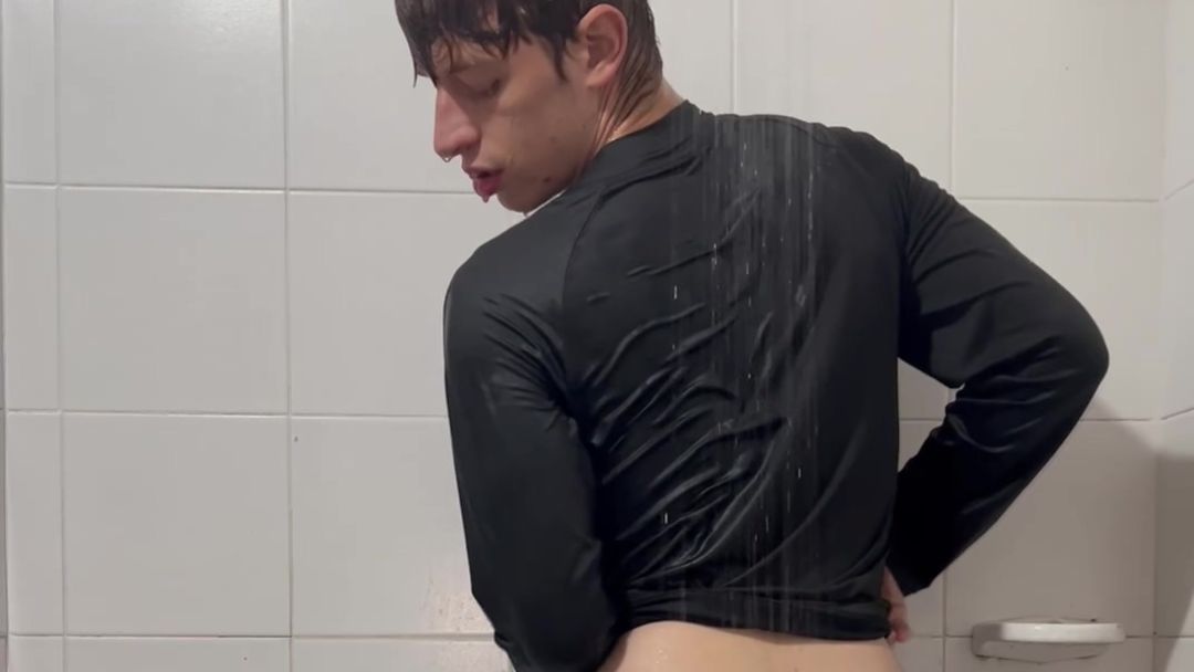 Gordy in the Shower with White Polo and Jeans with Shampoo