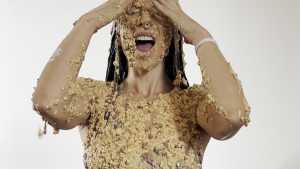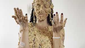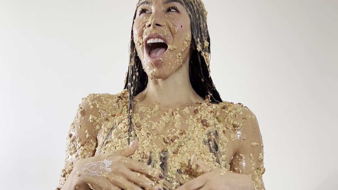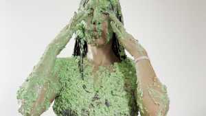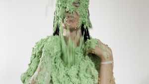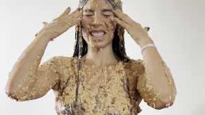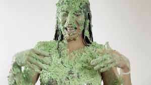 Paola returns to The Slime and Pie Show to receive a seriously messy slop bucket followed by a huge bucket of green slime, great scene!