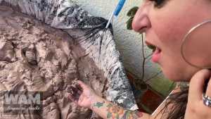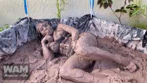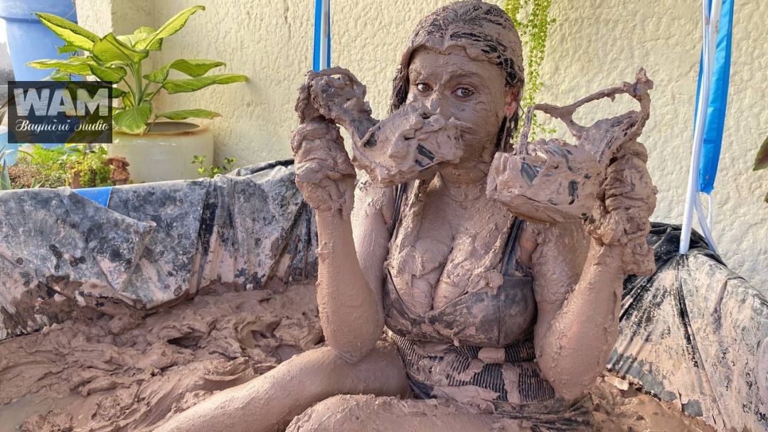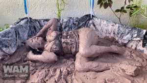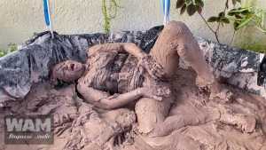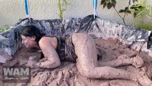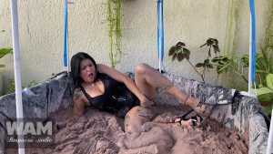 I slowly got into the pool with the thick, deep mud. My heels started to sink. It was all wonderful--a clay treatment in party clothes. I had no idea how much fun it would be. I played with all the mud, covering my clothes and hair, lying down and rolling around, touching myself, and getting all the mud inside my new clothes. Definitely a delight for mud lovers.