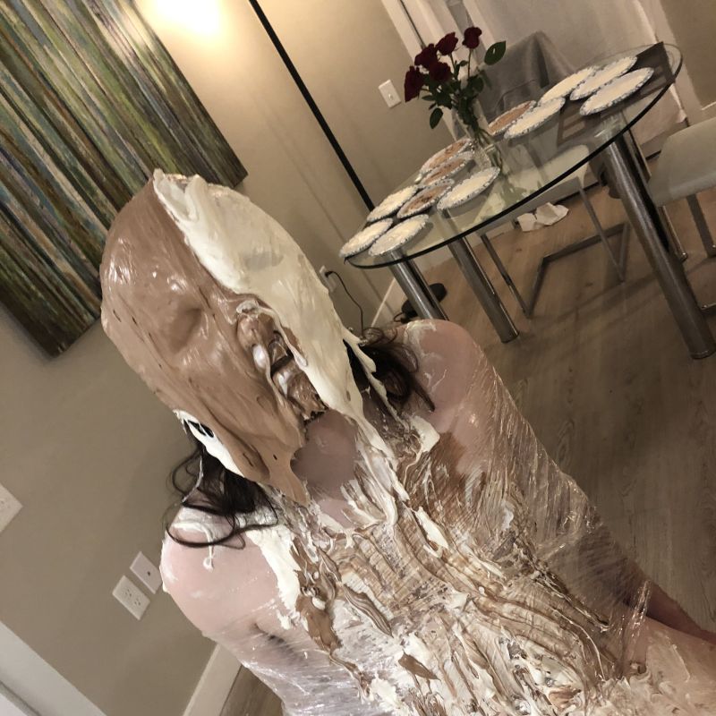 After having to strip and get pied 9 times in "pov Pie Trivia" Leila and her assistant end up in the bedroom. She starts off covered in sticky colorful pie goop, on her knees sucking his dick. Then she rides him for a while before sucking his dick some more and jerking him off until he cums on her messy face...