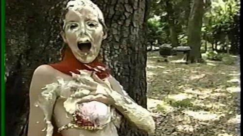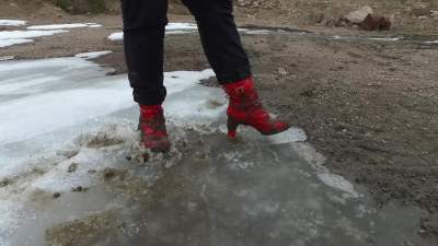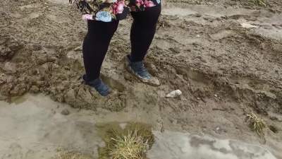 Small quarry and pond of water and mud surrounded with with piles of dirt and one Birgitta and her red boots trying to walk around the pond sinking more and more with each step to almost over her boots.