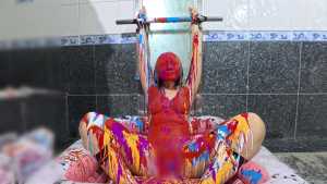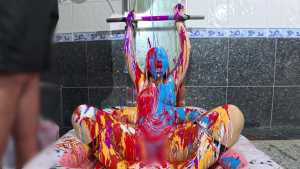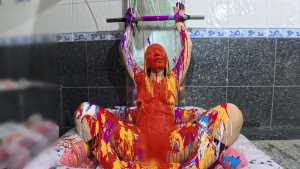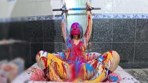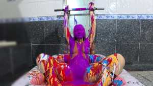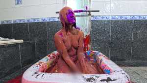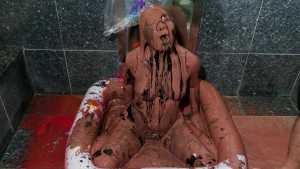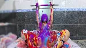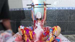 Today, her hands and feet are restrained so she cannot move, and various colors are poured onto her. This is a video of her, unable to move, having different paints poured over her. Partway through, the restraints are removed and black paint is poured on her. At the end, there is a scene where the paint is washed off.