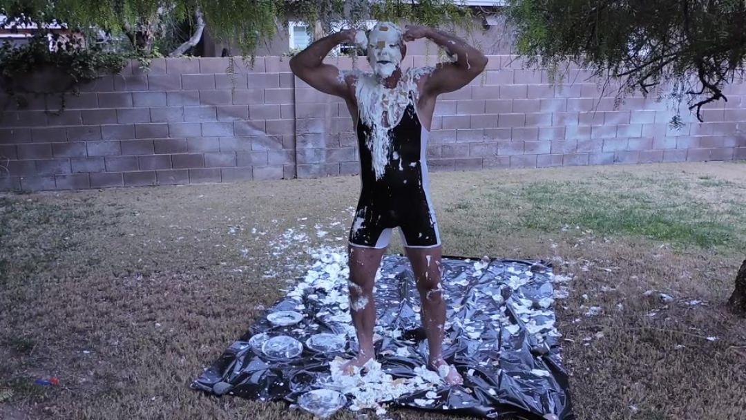"Musclestooge submits to a dozen pies thrown in his face and gets manhandled"