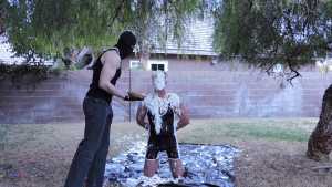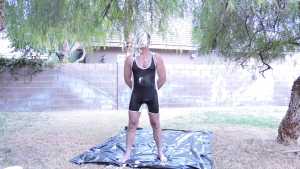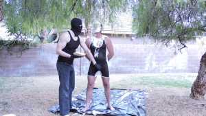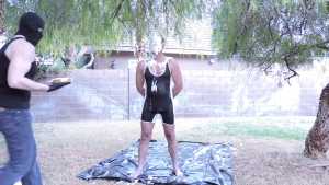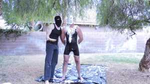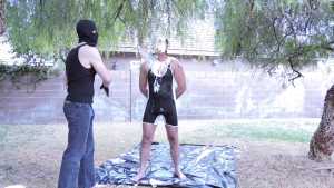Musclestooge submits to submissive humiliation at the hands of the Messicutioner outdoors. Musclestooge is geared barefoot and down to only a black, sheer, mesh singlet which exposes his cock. His hands are shackled behind his back. He takes a dozen cream pies to the face, thrown and smashed, for the pleasure of Messicutioner. Messicutioner also takes the liberty of groping Musclestooge's crotch, and plays with his ass, as he hits him in the face with pies, confirming his command. Messicutioner completes his control session with a humiliating photoshoot of a messy Musclestooge.