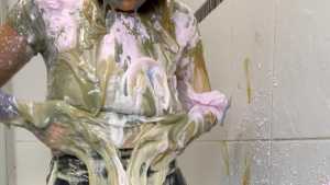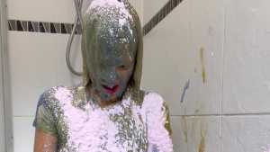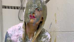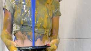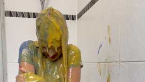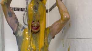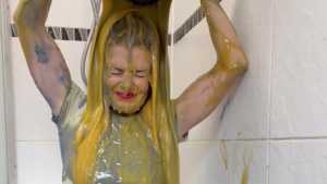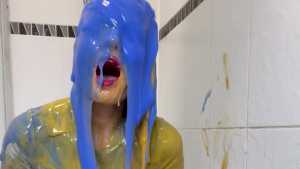 She of course accepts and does a couple of head dunks right into the gunge, before we start to pour blue gunge from above covering Robyn from head to toe, she even opens up her leather trousers to allow some gunge inside! Robyn then dunks her feet into the warm gooey gunge to make sure she is completely covered, before both buckets are emptied right over her head and she's sprayed with pink foam to finish off her very messy fun!
