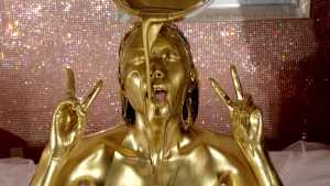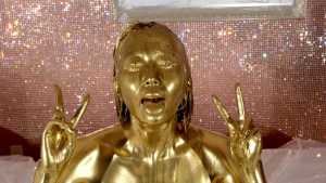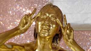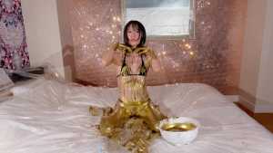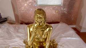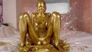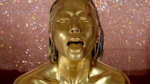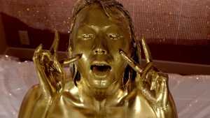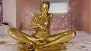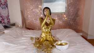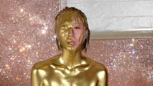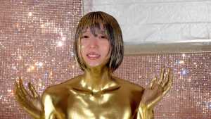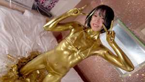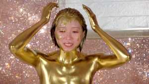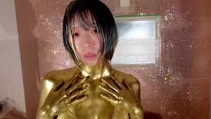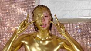 What kind of look will she show us with gold dust? We start applying it to her body. For her face, she paints it half and half because that way, she feels she looks less human. She pours the gold over her head again and again, reveling in the experience.