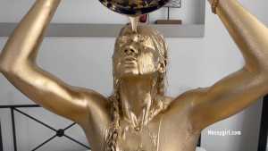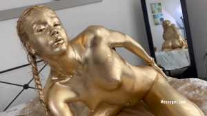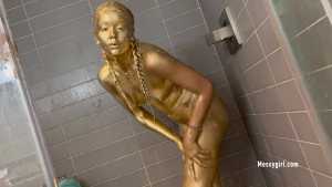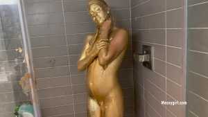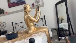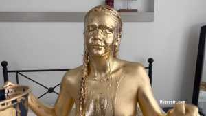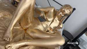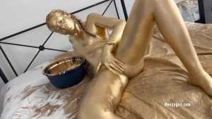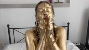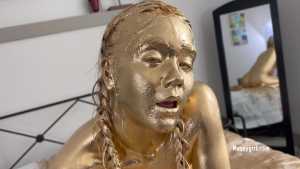 Adorable Jasmine does her first gold paint shoot and she doesn't disappoint. She shows it all as she covers herself head to toe. You especially get a nice view of her gold covered pussy and asshole in this one. You can tell she is enjoying it as she keeps looking at herself in the mirror. She even takes selfies of herself in the middle of the shoot. Very sexy!