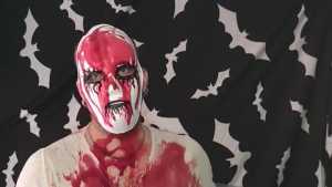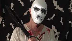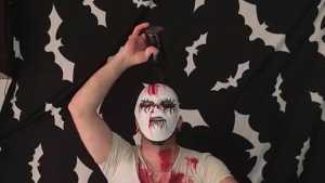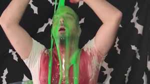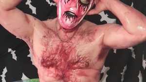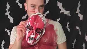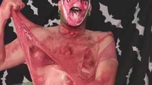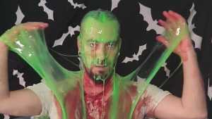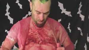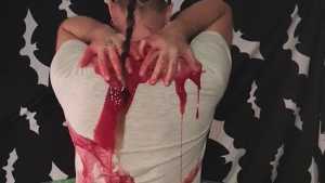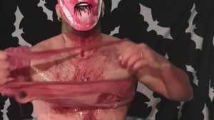 Happy Halloween, everyone! In this scene, I'm wearing a mask and wielding a machete, which I use to rip my clothes off. I'm covered in red and green slime, ending up completely naked and slimy. The whole thing has a horror theme.