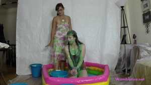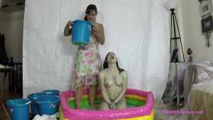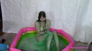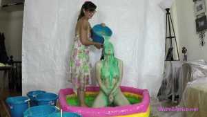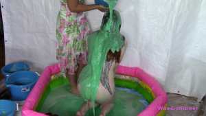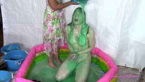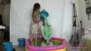 Mistress Sarah leads her sub, Leila, while she is blind-folded and gagged. She makes Leila kneel down in the center of a blow up pool and tells her she has a surprise for her. Sarah takes a bucket of green slime and pours it over Leila's head. She laughs at Leila making fun of how helpless and messy she is. She then removes Leila's blind fold and ball gag. Sarah is a very strict Mistress. When Leila complains Sarah makes Leila open her mouth and lean her head back so she can pour slime right into Leila's mouth. Sarah uses a total of 6 buckets alternating pouring the slime over Leila's head and into her mouth. Some of the buckets of slime are really cold and make Leila shiver. When Leila asks if the slime will ruin her clothes Sarah gets annoyed and punishes Leila by cutting and ripping her shirt off. She then makes Leila remove her shorts even though her wrists are duct taped together which makes it awkward. Sarah then pours more slime over Leila before cutting off her tiny g-string thong. Sarah makes sure Leila is fully covered by having her turn around so she can pour some slime down her back. When Sarah runs out of slime she tells Leila to stay put and puts Leila's gag back on. Sarah walks off to go clean up and leaves Leila gagged and naked in the pool of slime.