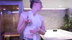 Mistress Splash dresses up in her secretary outfit before slowly soaking herself in the shower. She then enters the hot tub where she takes off her shirt exposes a skin tight tank top with black bra underneath.