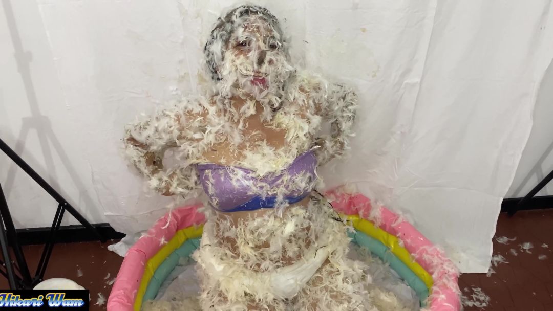 Sofia, covered in shaving cream and drenched in breakfast syrup, is wrapped in feathers by her friend Hikari without hesitation. Hikari uses numerous goose feathers to cover her from head to toe for the first time. After looking sexy in her white underwear, she's now the Feather Queen, haha...