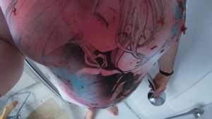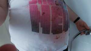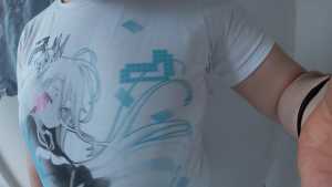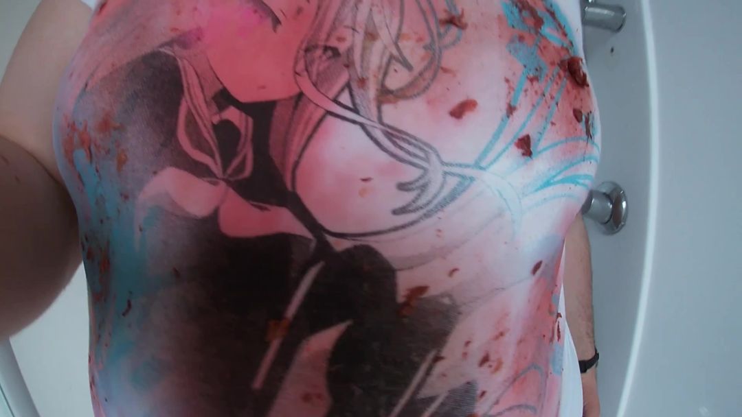 That afternoon, I realized the strawberries I had bought a few days ago had actually gone bad very, very fast, to the point where they were starting to foam. So I couldn't reasonably eat them, but quickly realized that although they weren't good for humans, they could still be eaten by a shirt. And it turns out I also had this t-shirt of Shiro from No Game No Life that would look perfect with strawberry coloring. So here I go, squashing my strawberries right on the print of the t-shirt, making the juice drip all the way down and coloring it completely red, complementing well with the cyan, black and pink colors of the print. Can the shower actually wash off the mess left by the bad strawberries?