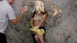 Adorable Valerie returns as a snotty influencer enjoying a tasting menu... with her face! Turns out she's actually great at adopting a classic "mean girl" attitude, even as you can kinda tell she's delighted to be getting messy yet again. (She eats *so* much pie off her face.) This one is heavy on the cakings: Six in all with amazing reactions including lots of legs flying and even a heel! But there's also plenty of real pies with amazing coverage, plus Val smashing herself perfectly (again) and a final epic sliming that she takes like a champ. (And some in her mouth!) Val's personality rules the day here, and even after taking mess for close to an hour, she's still posing and laughing and playing. What a gal!