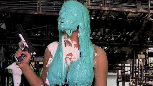 Our newest baker shows us the various types of Slapstick pies... and chocolate... and milk... and flour... [Jen gets nailed with many real pies, followed by chocolate face dunkings, flour, and milk! Plus some self hosedown.]