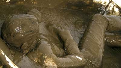 Next he lies down on a bench wearing his best Balr outfit. His hands and feet are tied then buckets of cold water are thrown over him. He finally manages to escape, all the while getting soaked.