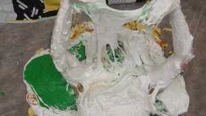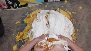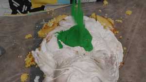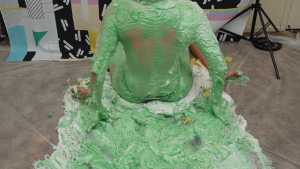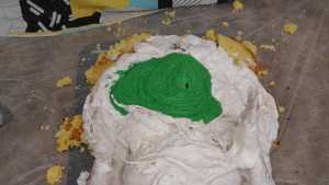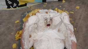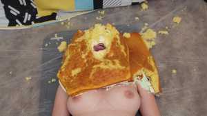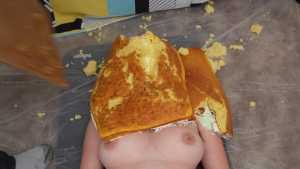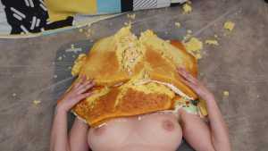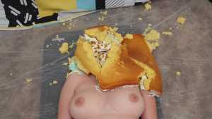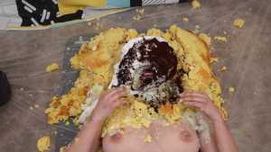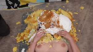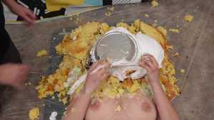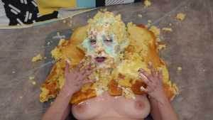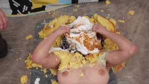 The scene starts with Pains lying on her back topless. She is a nervous wreck with what is about to happen her, and rightfully so. Within seconds shes about to have 4 heavily frosted cakes slammed directly into her face from over 5 feet above. She receives cake after cake and her reaction is priceless. After 4 cakings her topless body is unrecognizable. Soon after she is clobbered with 9 fluff pies. Unfortunately the pies were so sticky they stuck to the tins and didn't come clean off immediately, but she was burried in fluff none the less. After that she receives a thick green sliming directly to her face. She is engulfed in slop from the neck up. She has a lot of fun throughout the filming and then spends several minutes playing in the left overs. She sits in a mound of cakes and buries her head in the residual slop. Pains is in her element!