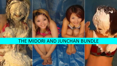 5. "Messy Olympics 2008" and 6. "The Slapstick Lesson"--I met Aika and Rika separately online, both interested in taking a few pies. (You know that story I sometimes tell about the one girl who not only didn't realize the modelling gig was for money, but actually thought that she would have to pay me for the experience? That was Rika, bless her kinky heart.) I'd has an idea for a sketch where two high school girls get a messy lesson in slapstick comedy from a dominatrix-ish teacher. Both Aika and Rika were up for it, so I pitched the teacher role to Junko. She was amused by the outfit and boots, and came on board for two scenes. The second scene shot was the slapstick lesson sketch, and the first was Junko indoctrinating the two pie virgins with a series of messy games.