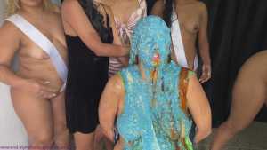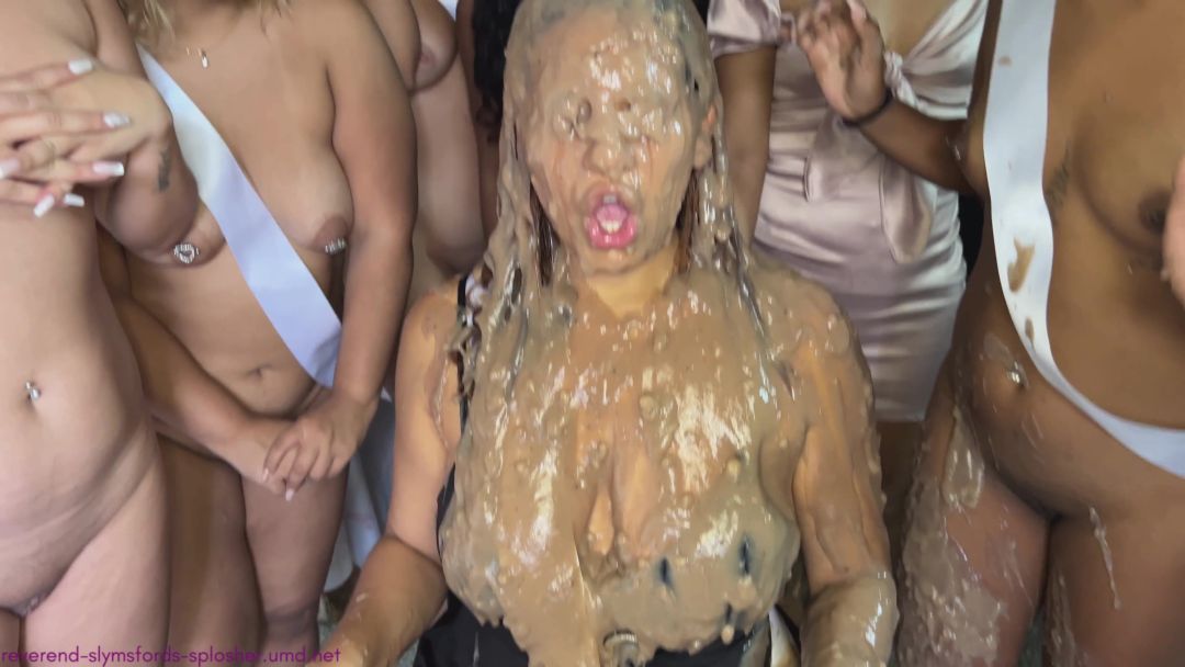 Jenny laughs and says "I might have guessed! Okay then Monarch... I am ready to accept. Let's see what The Monarch wants me to receive" Jenny welcomes everyone back and says that she has no idea what The Monarch has in store for her. Without warning, melted chocolate falls from the ceiling, covering Jenny's hair and face, of course, and also targeting her beautiful dress. We hear the girls off camera gasp with shock, and then laugh in delight. When all the chocolate has been poured, the other girls surround her and are laughing and pointing etc. Cynthia and Brigitte say, with a little sarcasm "You can't stay in that dress Jenny... you'll catch a cold" so Jenny then says "Oh, alright then" and does a sexy striptease to nude, to the enthusiastic cheers of the other girls. When she is naked, someone does a cheeky quick squeeze of her boobs, and then Jenny says "We will see what else The Monarch has in store for me, after the break" cut