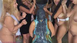 Then a whole bag of flour is drizzled over her face by Brenda. Next Jenny is lifted into the chair, and has her hands behind her back, and it's then time for the gungings--we have 1 x bucket of guacamole, 1 x bucket of caramel, 1 x bucket of molasses, 1 x bucket of porridge, and 2 x buckets of slime The girls take turns to empty a bucket over Jenny's head and Jenny gets a really thorough gunging After all this Jenny is sent to shower... Then there's a post shower pie... but who gets it?
