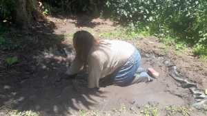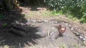 Dressed in a formal black dress and blue formal shawl/blouse, I enter the mud pit barefoot, getting my feet nice and muddy before covering myself in mud.