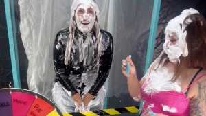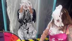Landing on instant Gunge on the spinning wheel in this game is exactly what it says the contestant will be receiving an ice cold gunging ready or not! Get the question Correct on the spinning wheel and avoid 1 item of clothing being stripped off, But watch out for the pies on the spinning wheel.Host swap on the spiny wheels means the contestant swaps roles with the host and the host is in until she wins the game or until who ever is naked first loses Landing on a pie means the contestant receives a pie however landing on a pie host will mean the contestant has a chance to get some revenge. if 5 items of clothing has been removed due to wrong answers given this will lead to the Icer Tank being activated and the contestant receiving a ice cold gunging. How do you think kacie got on?
