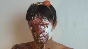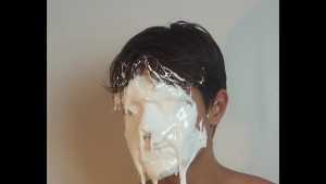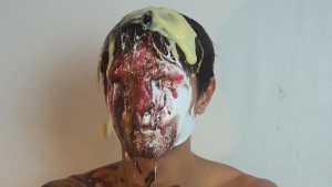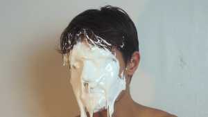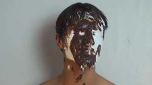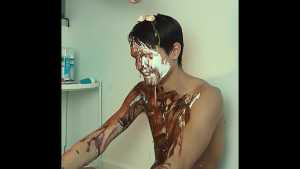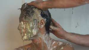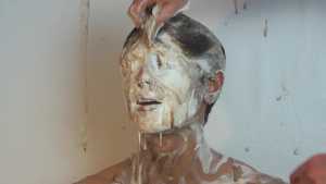 Then it's his beautiful hair's turn to be ravaged with raw eggs, followed by vanilla cream, but he continues to smile.