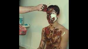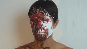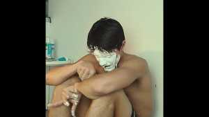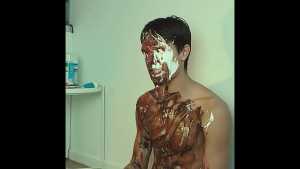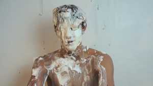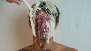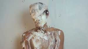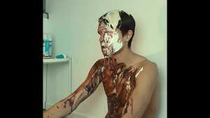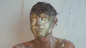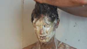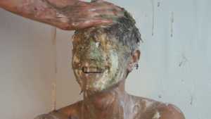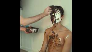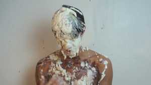 A can of whipped cream is then sprayed all over his head, and the cream is also spread all over his body.