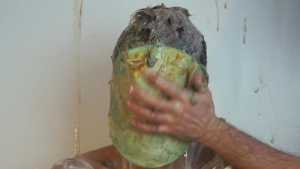The grand finale arrives: he receives a messy massage with all the mess and disgusting messy mixture. Another pie is smashed in his face, and his hair is shampooed with the mixture.