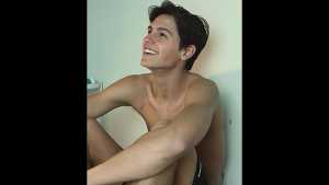 He sits shirtless, his hair perfectly styled, and tastes some marshmallow fluff. He seems to be enjoying it immensely!