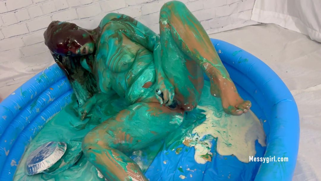 This is by far Carmilla's naughtiest shoot to date. She walks in and teases what she is about to do by showing off her pussy and ass from under her dress. She then shows the mess that will be used on her as she gets into an inflatable pool. First thing she does is pie herself hard in the face. Then she gets on her back and lifts her dress to show off her pussy and tight asshole. While on her back she has pudding, slime and melted ice cream poured on her face. She rubs the mess all over herself and brings out a vibrator. More mess is poured on her as she rubs the vibrator on her pussy. She soon gives herself multiple toe clinching orgasms as she rubs more mess on herself. She then has her pussy hosed down with a squirt bottle. Hot stuff!