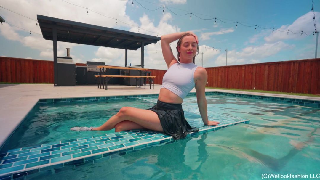 Victoria is by the pool wearing a sexy LuluLemon skirt with a white crop top and sneakers. She first dances around the pool spinning her skirt around looking all cute. Then she sits down next to the pool and stretches a little bit, before she checks out the water and decides to slide in the pool. Once she is in she gets her hair partially wet and then she plays with the floatie for a little bit while making her hair more and more wet. She swims for a little bit and is floating on her back, while soaking her hair completely. She lays down on the tanning ledge for a little bit and sits in the hot tub for a short time. She later takes a dive off the hot tub. At the end she shows off her wet outfit on the outside and also plenty of times during the clip.