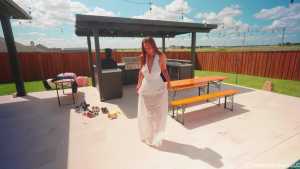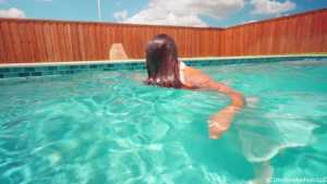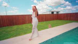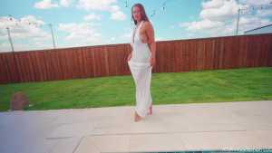 Danielle is by the pool wearing a very sexy sheer white dress with heels and no bra. She first shows off her sexy dress while dry. Even dry you can see her legs through it. After walking up and down the pool, she steps onto the tanning ledge to get her heels and the bottom of her dress wet. It already has a nice cling to it. After briefly coming out she steps in all the way, completely soaking her outfit. She also dunks under, getting her hair wet as well. She now comes out with her dress completely clinging to her body. She dives back in the pool and swims for a little bit. She also poses in her sexy wet outfit and does some hair flips, as she comes up and her hair is all over her face. Next she comes back out and wants to dive back in. As she dives back in, the top of her dress comes lose and reveals her tits. She swims and poses for a little while with her dress halfway off. Next she comes out and takes her dress off. Now completely nude, she dives in the pool again for another swim, just wearing her heels. Scene contains underwater footage.