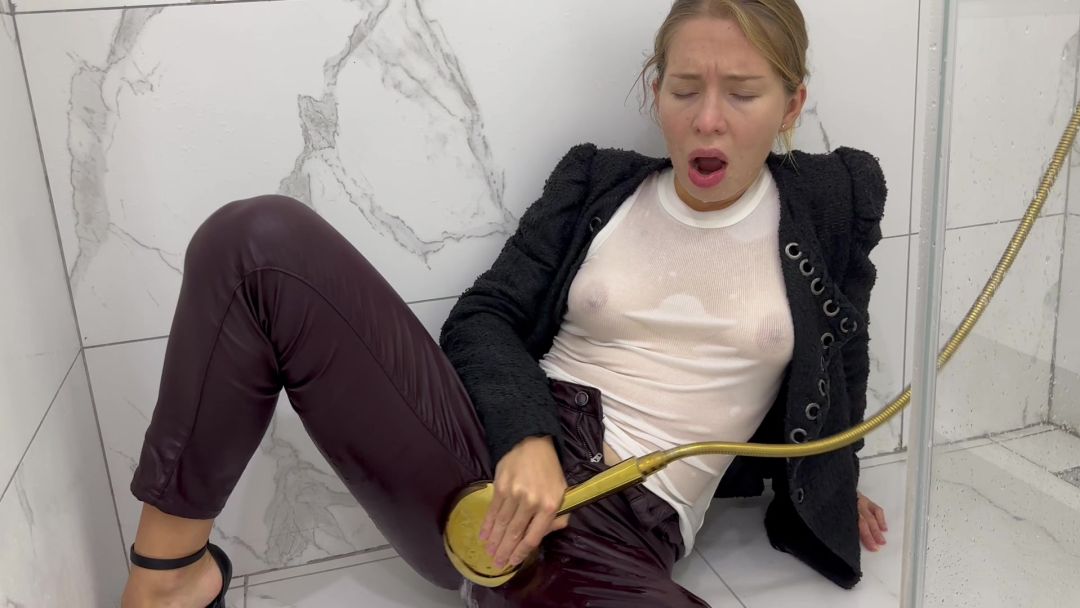 Wetlook in Office Shirt and Leather Skirt! Wet Hair!