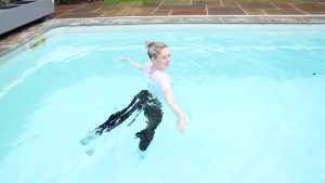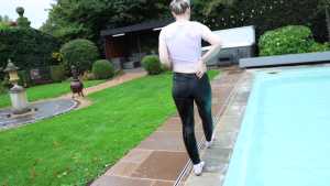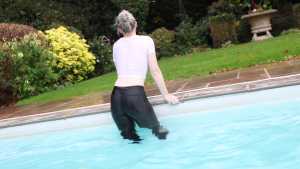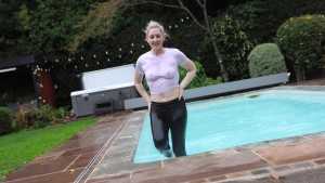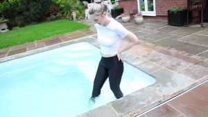 Mistress Splash wears a tight white t-shirt and shiny black leggings as she gets totally soaking wet in the pool and hottub. The t-shirt goes see-through and clings to her body as she soaks herself in the water.