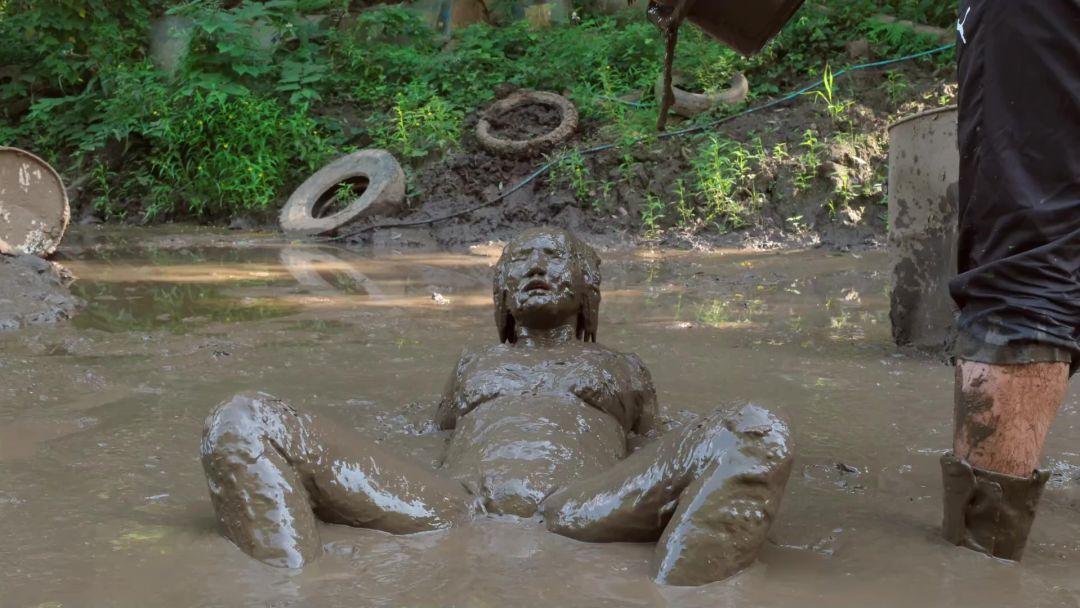 Once she's covered, I spread it by hand, turning her into a mud statue.