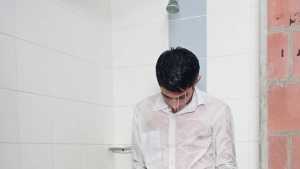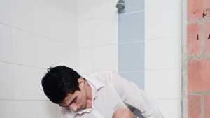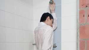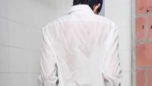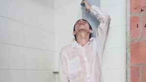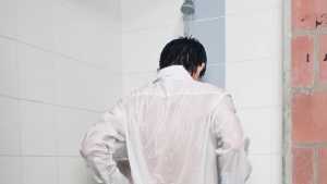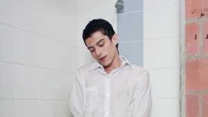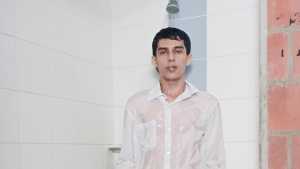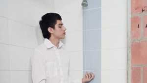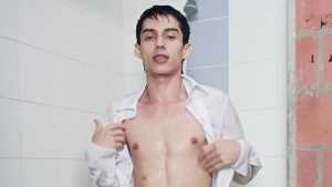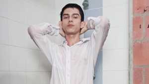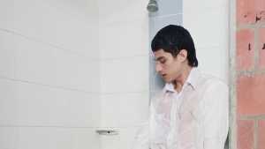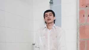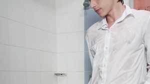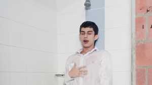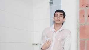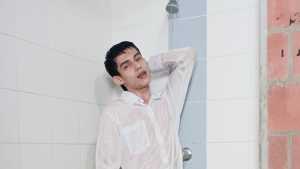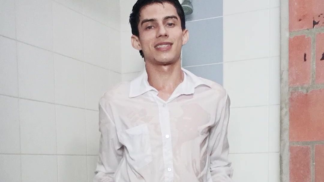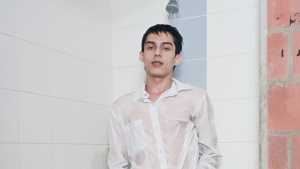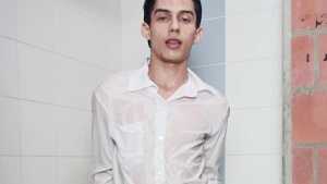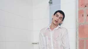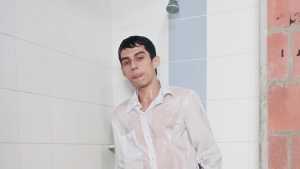 In his first show, Zaid wears a white shirt and jeans with red boxers underneath. And he's truly at ease in the shower, looking like a veteran despite his 20 years. With some nice soft music in the background, he's having fun under the water, and the full shot from head to toe is also very nice. Good first time!